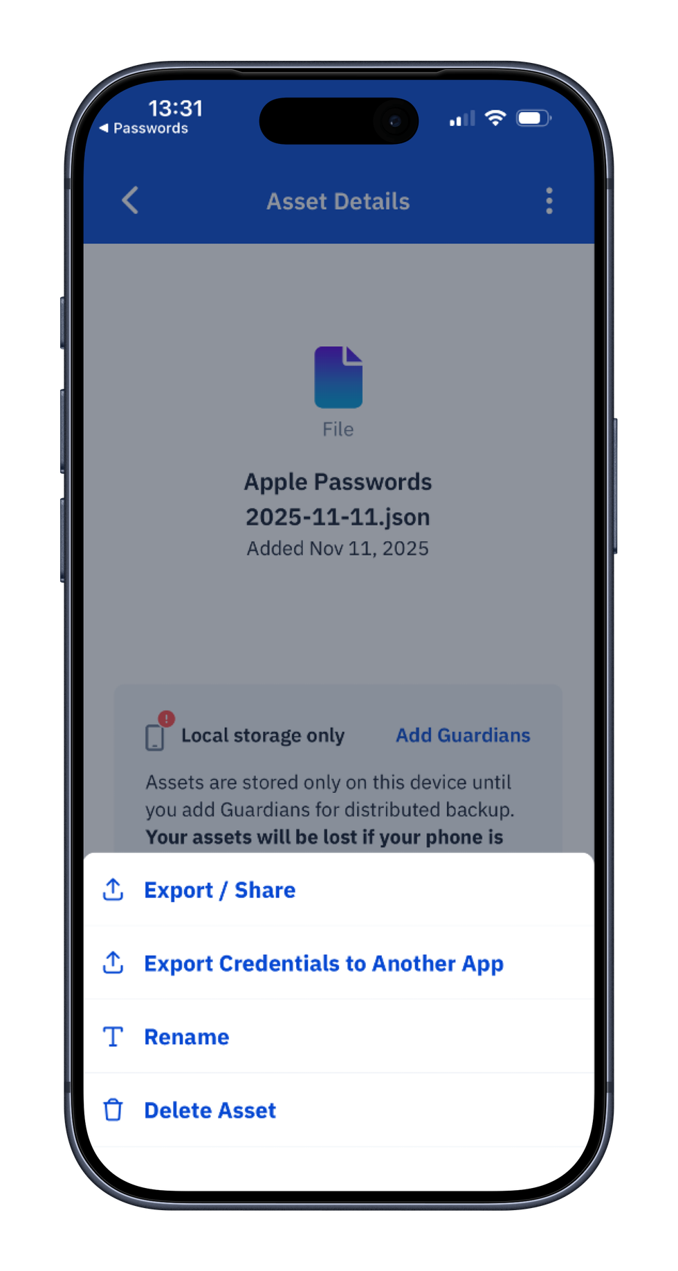 Your credentials are encrypted, split, and stored across your chosen Guardians (trusted people or your own devices), not in a single cloud account or server. - Inheritance-ready by design