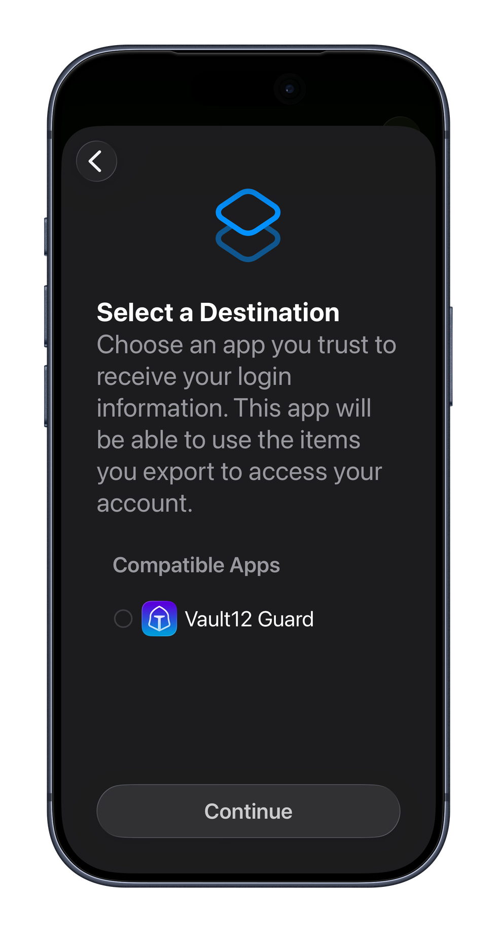 Because Vault12 Guard uses the same system-level transfer mechanism as Apple Passwords and leading managers like Bitwarden, you can always export your credentials back into another app later.