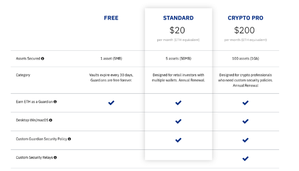 Note: VGT holders who choose to fund their accounts with VGT instead of ETH automatically receive a 50% discount. - Guardians can choose the incentive that they wish to receive for guarding Vaults. For now the incentives are free, 0.5 ETH and 1 ETH per annum, and will be paid every month.
