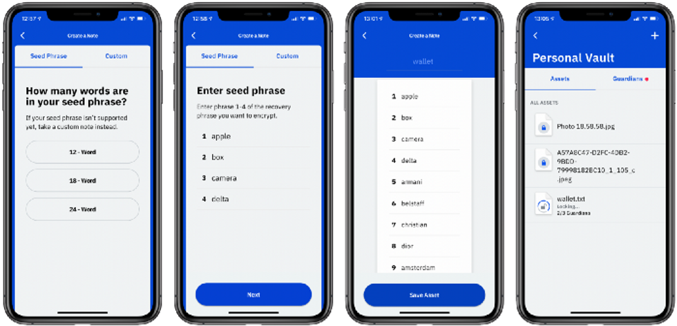 CryptoNote. The new method for adding assets to the Vault, by entering 12-, 18- or 24-word seed phrases directly into the app, instead of writing them down on paper. Using the "Text/Custom" option you can also enter regular text, e.g. a password, hint, or other instructions. This data is never stored anywhere, it's encrypted right away and distributed to guardians.