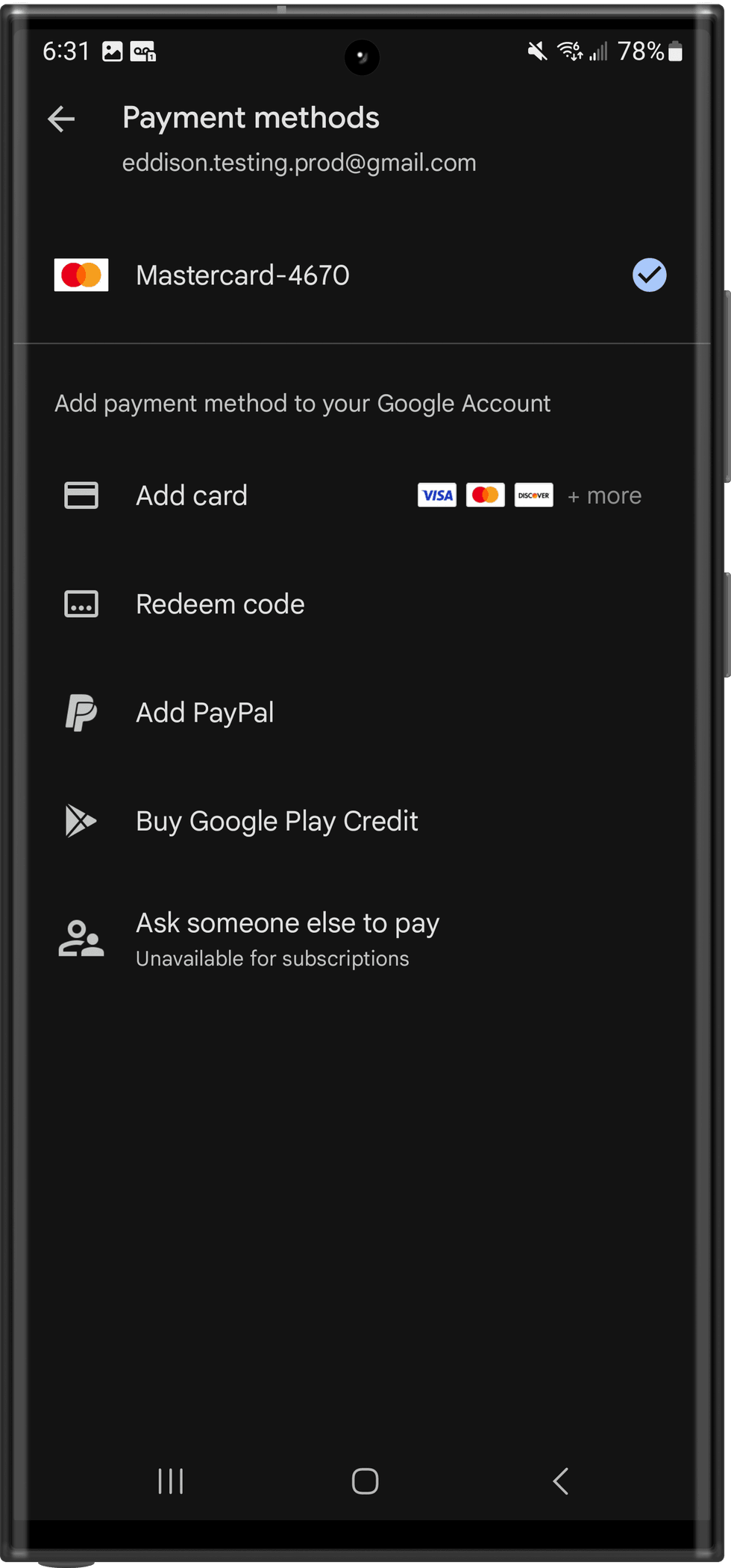 7. In the Google Play payment screen, click on your default funding source to access the Payment methods screen.