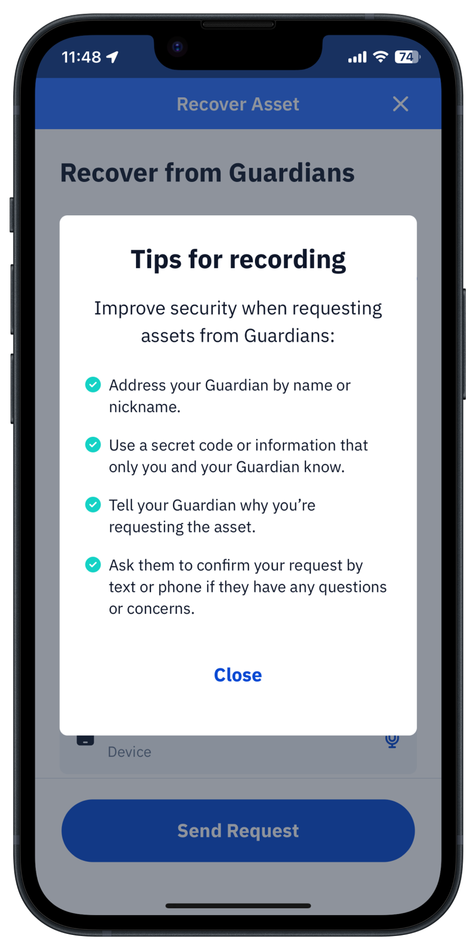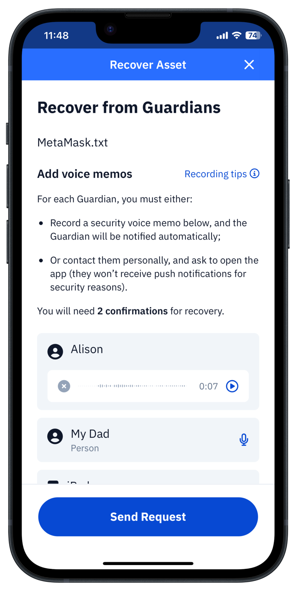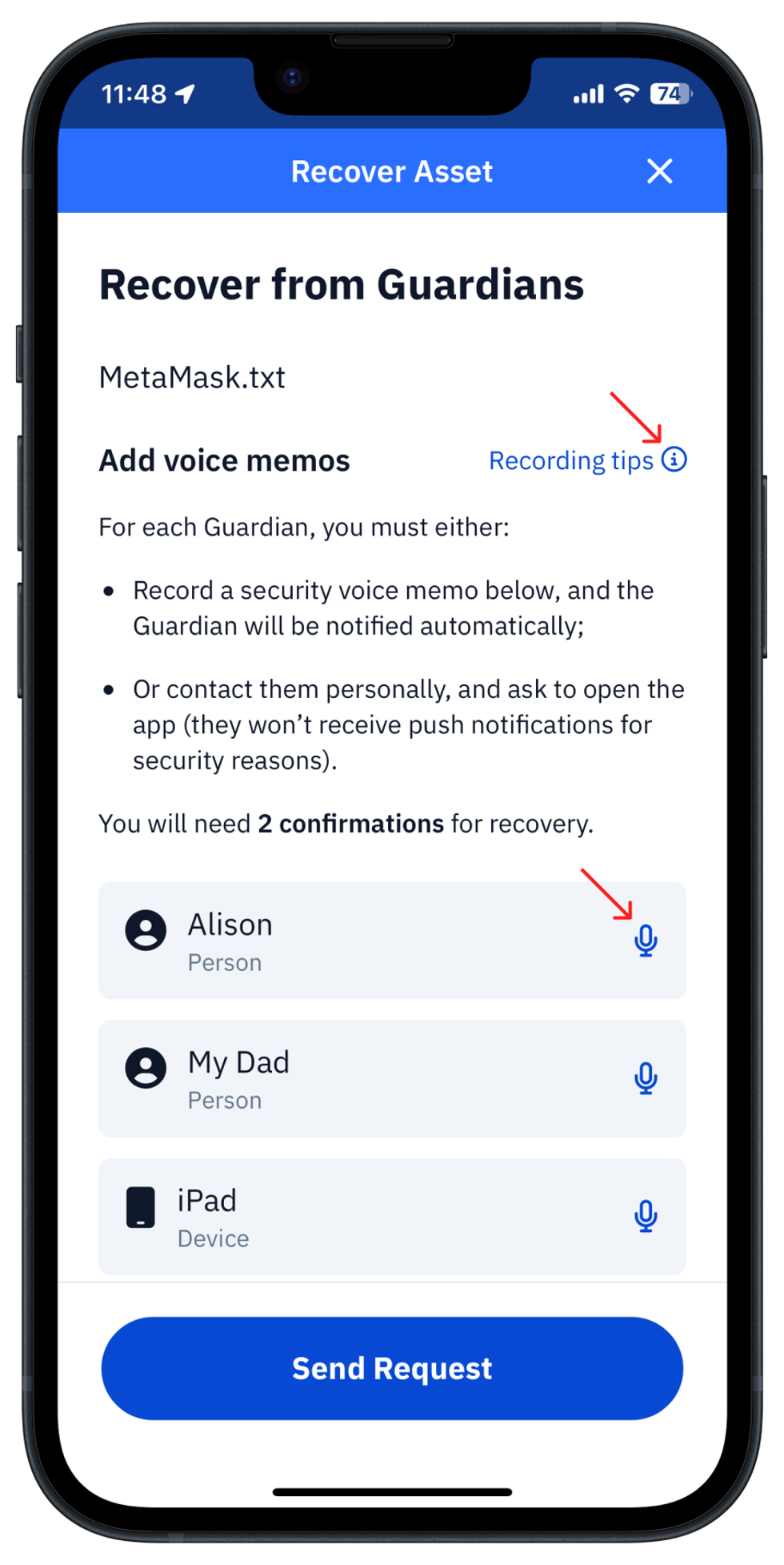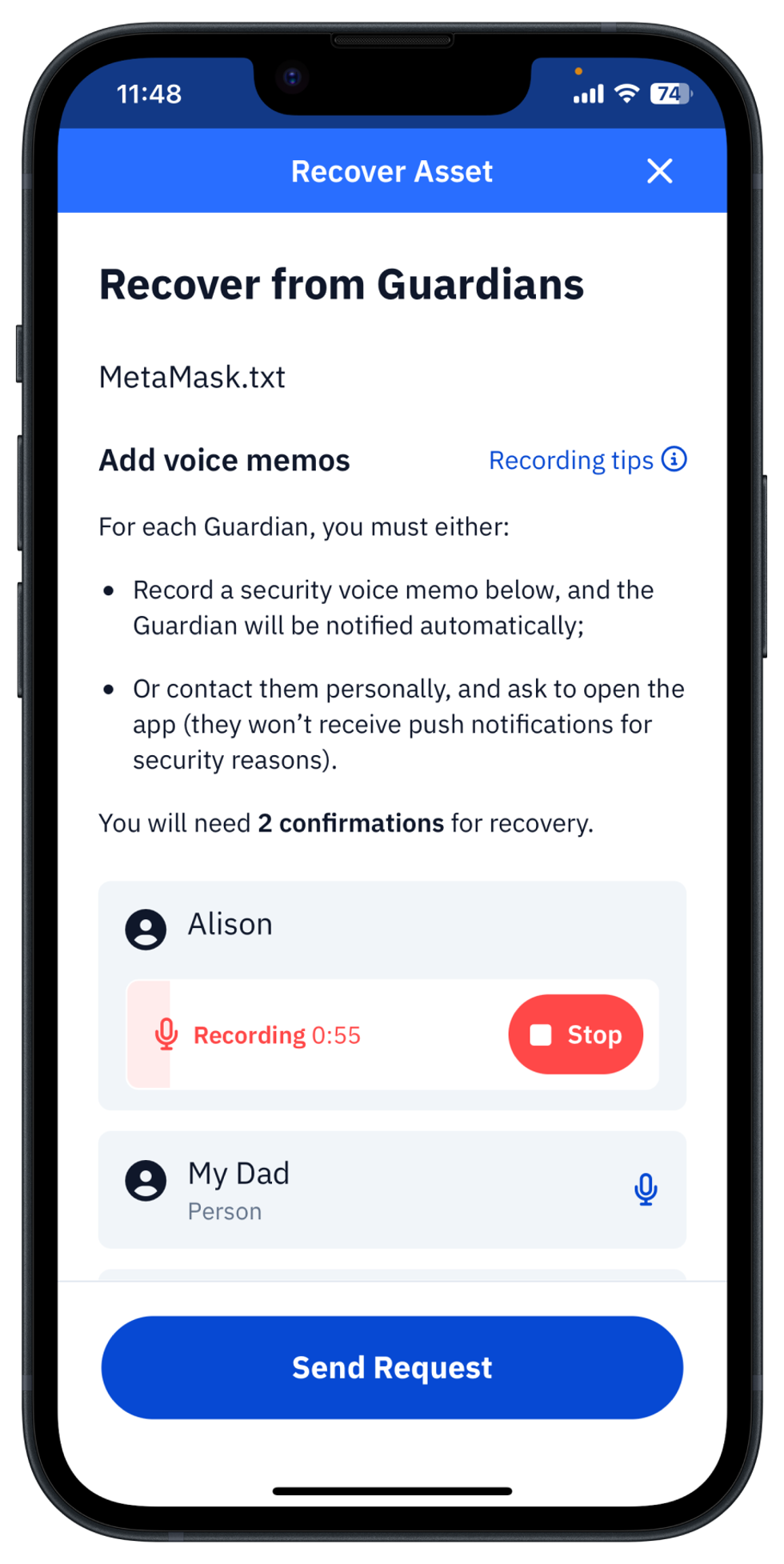 The brand new Voice Memos feature appears first on Recover Asset Request screen as an Record button with the icon of microphone in front of every Guardians name. The usage of this function is pretty intuitive. However to start using it you have to decide about your voice-level security setup with Guardians. Recording tips might be helpful to recall about possible options.