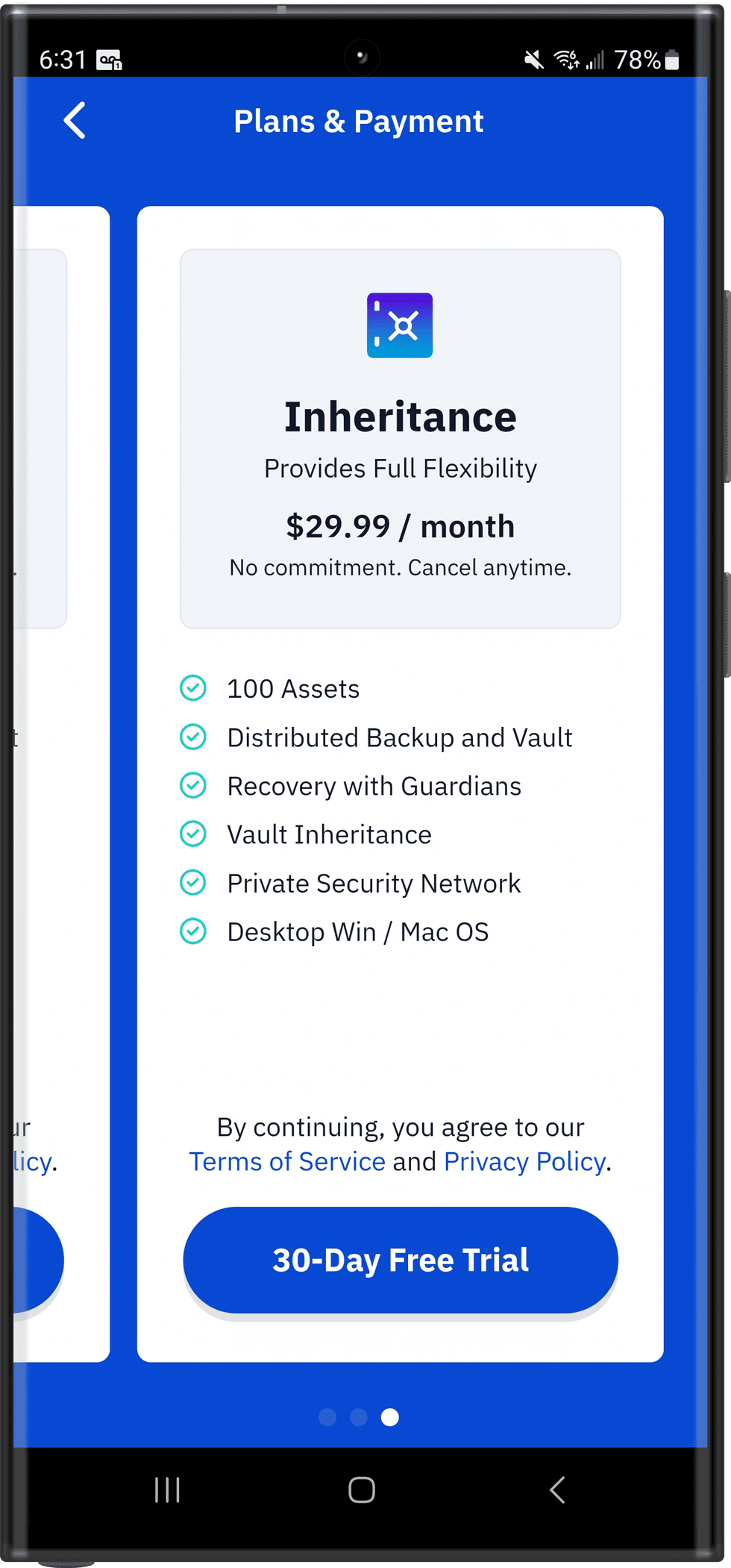 4. Confirm the 1-year free offer to connect with your Apple ID. Your premium subscription or promotional access will be applied automatically — you are good to go! Open the app and set up your Vault and Inheritance plan with your choice of Guardians.
