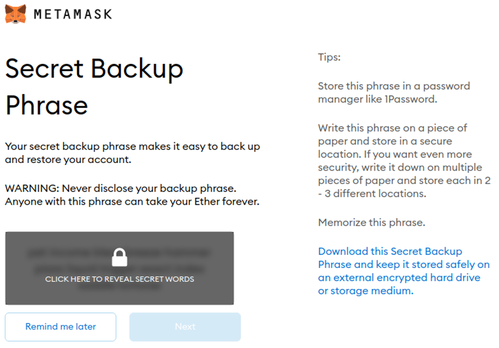- MetaMask will first show you your secret backup phrase, called your `Seed Phrase`, grayed out. Click in the box to reveal your seed phrase.