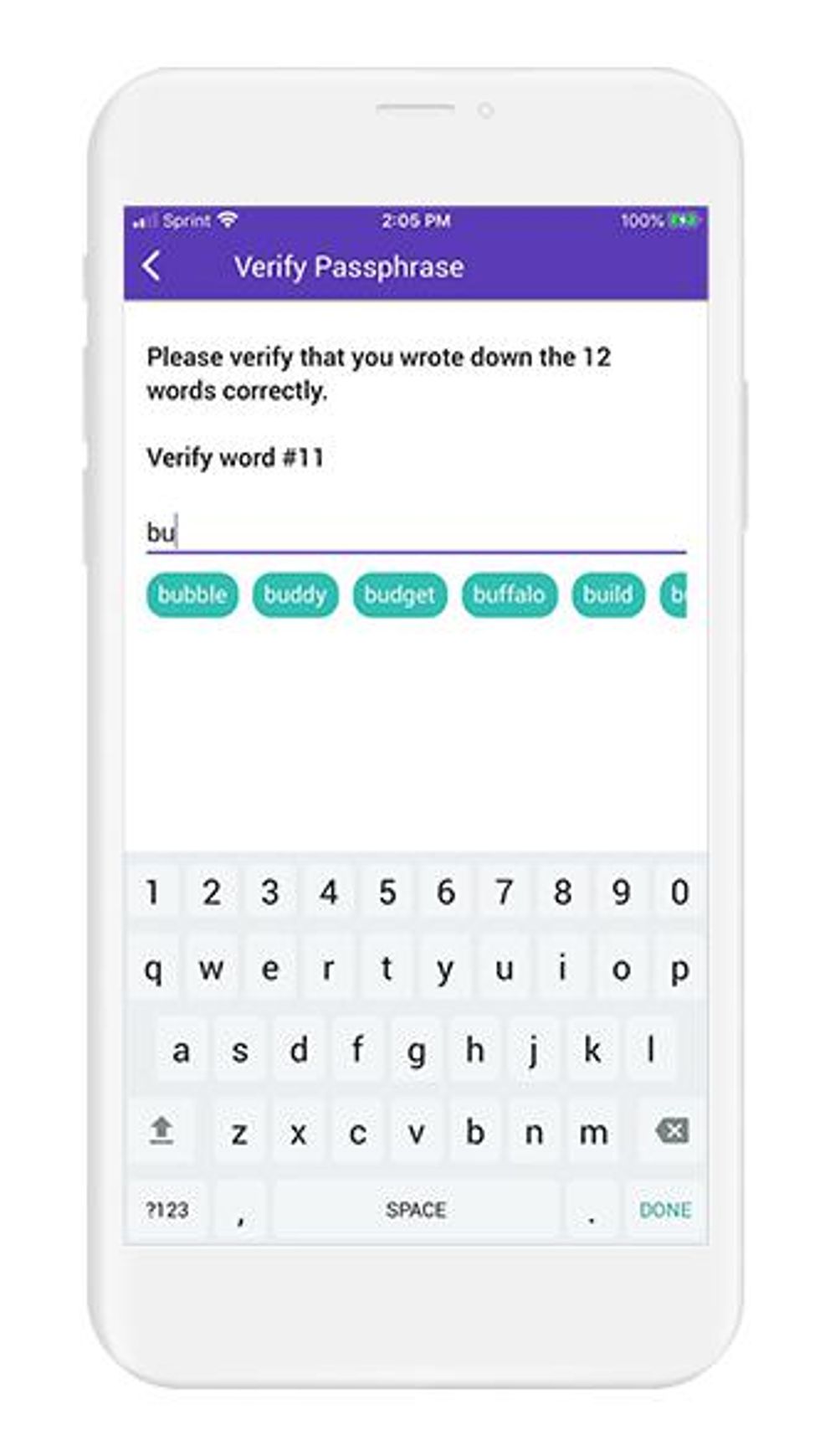 • Using your recovery phrase as a reference, enter the correct words to verify you have copied down your recovery phrase correctly.