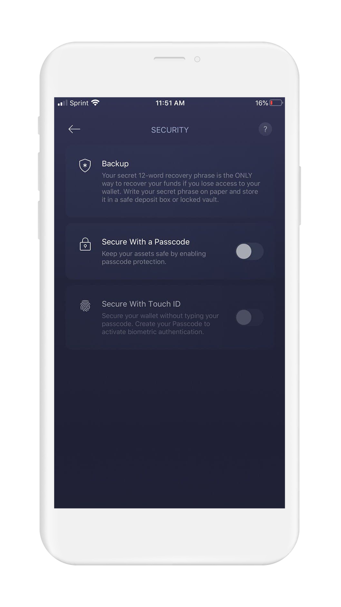 Now that you have initialized your wallet using your recovery phrase, it is time to secure your wallet by requiring a passcode and/or biometric authentication. The level of biometric authentication available to you will depend on what is enabled on your device.