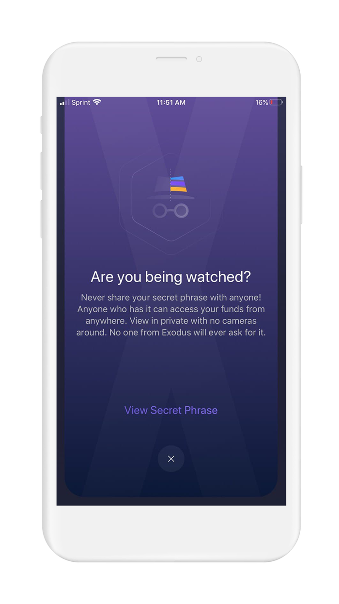 Exodus Wallet's recovery phrase warning page: Are you being watched? Never share your secret phrase! Anyone who has it can access your funds from anywhere. View in private with no cameras around.