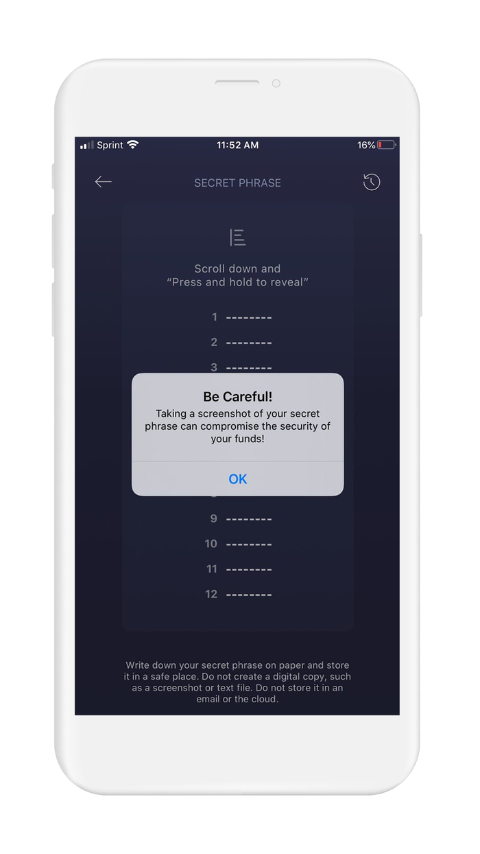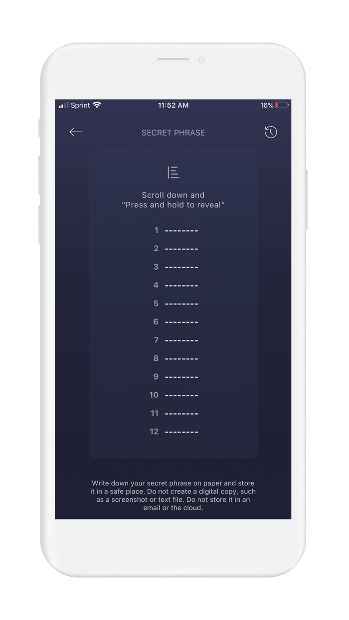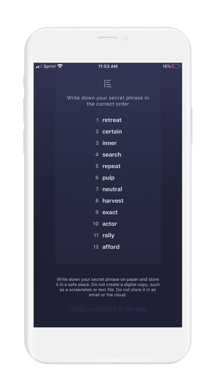 • Press and hold where prompted, and your recovery phrase will appear on the screen. When you let go, your recovery phrase will return to being blurred out.
