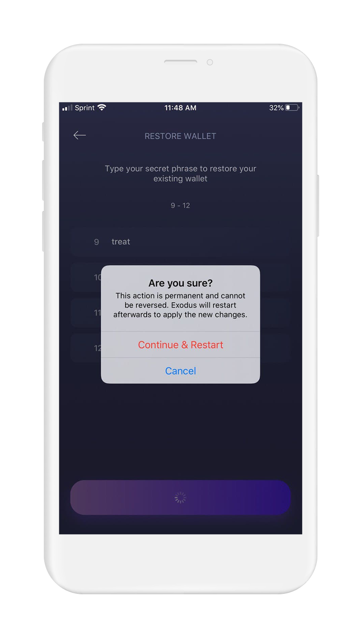 Exodus will now ask you if you are sure you want to proceed. This is because Exodus does not support multiple wallets. Initializing a wallet will remove any previously existing wallet and replace it with the wallet being imported. Tap on "Continue" to proceed.