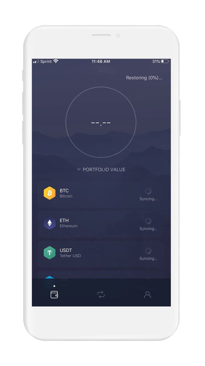 When your wallet first loads, it will appear empty. Don't worry, Exodus is scanning your wallet addresses to restore your accounts and transactions. Where the account balance is listed for each coin, you will see a syncing symbol. You can track the progress of your import at the top of the screen, where a progress bar will show you the status from 0-100%.
