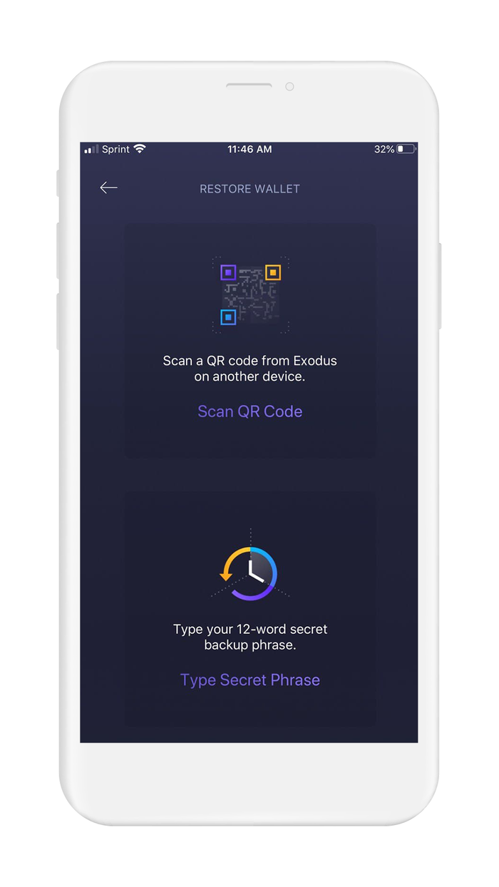 • Scan QR Code - This option is for syncing Exodus Wallet across different devices. The QR code reader will not process standard BIP39 QR codes. If you want to use this feature, you need to already have an active Exodus wallet.