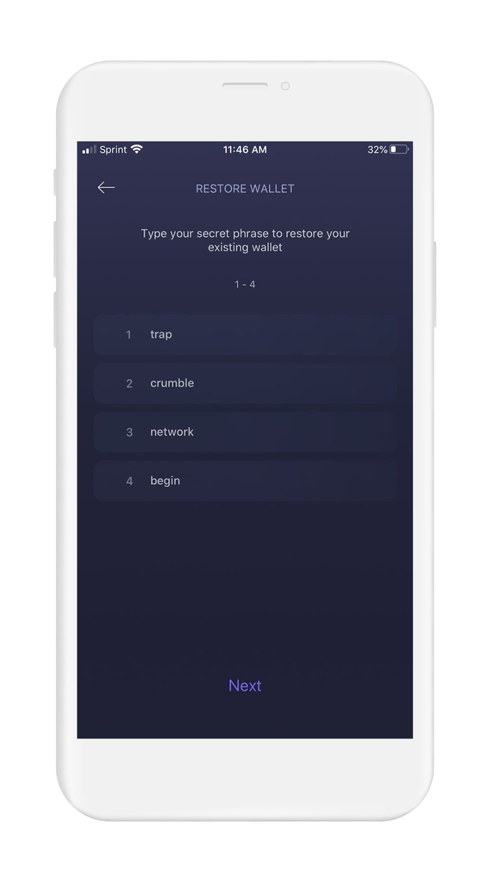 • Enter words 5-8 of your recovery phrase, matching each word to the correct number label