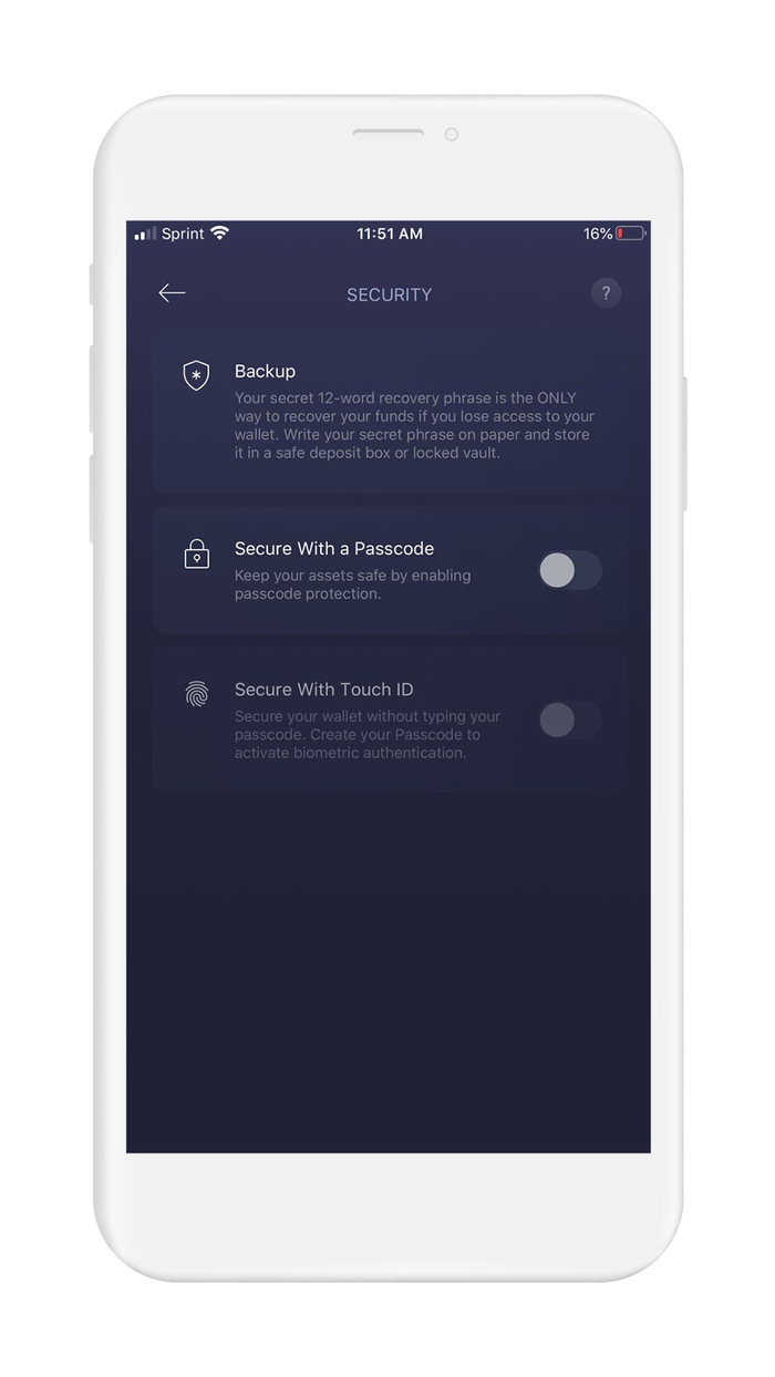 Now that you have initialized your wallet using your recovery phrase, it is time to secure your wallet by requiring a passcode and/or biometric authentication. The level of biometric authentication available to you will depend on what is enabled on your device.