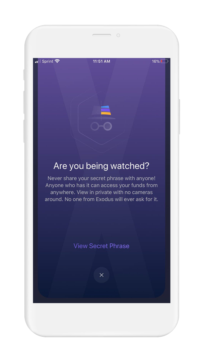 Exodus Wallet's recovery phrase warning page: Are you being watched? Never share your secret phrase! Anyone who has it can access your funds from anywhere. View in private with no cameras around.