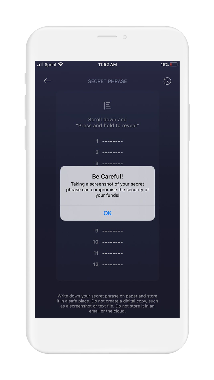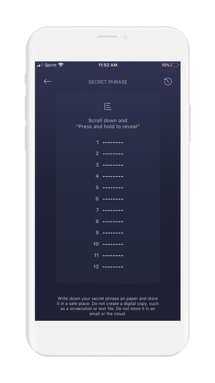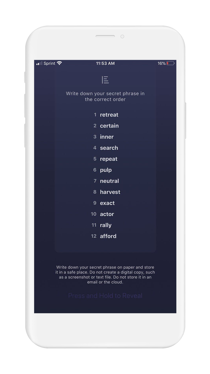 - Press and hold where prompted, and your recovery phrase will appear on the screen. When you let go, your recovery phrase will return to being blurred out.