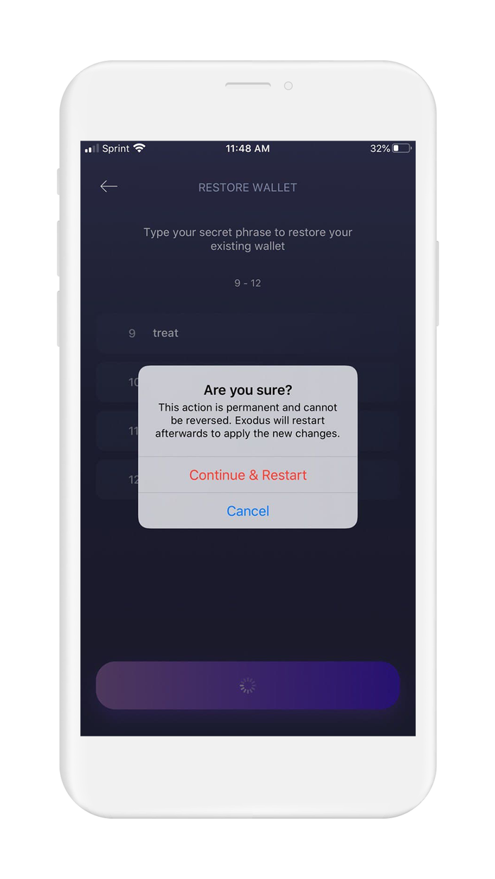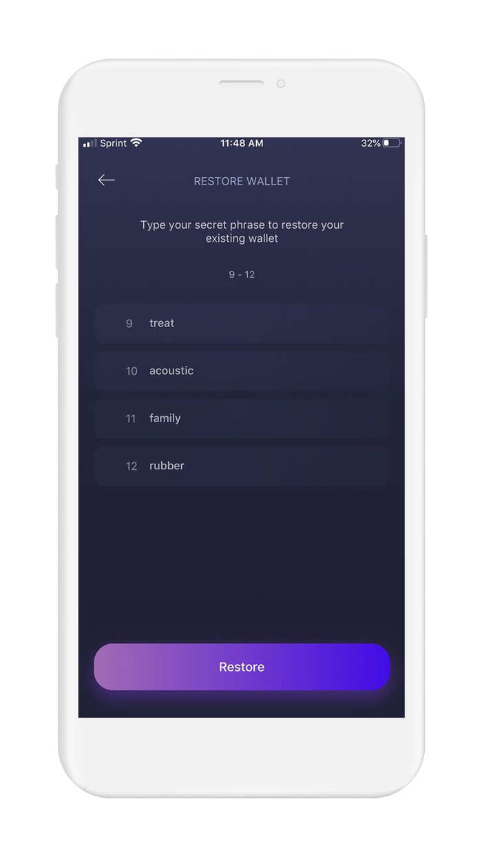 - When you are finished, tap on "Restore" to initialize your wallet