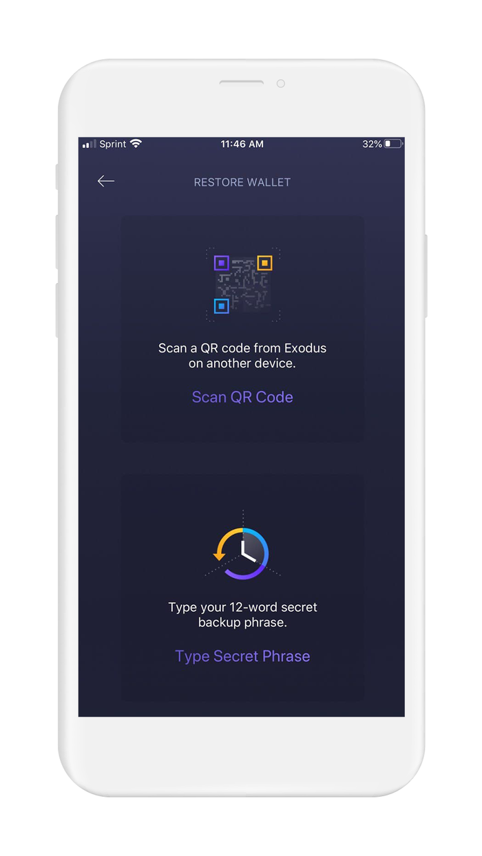 - Scan QR Code - This option is for syncing Exodus Wallet across different devices. The QR code reader will not process standard BIP39 QR codes. If you want to use this feature, you need to already have an active Exodus wallet.