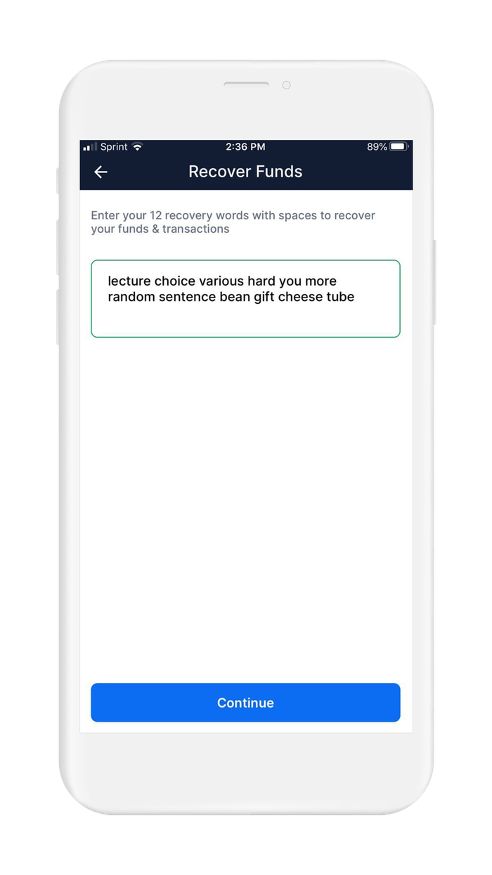 Both valid seeds, only 2 words are swapped - When finished typing in your recovery phrase, look it over to make sure it is correct, then tap on `Recover Funds`.