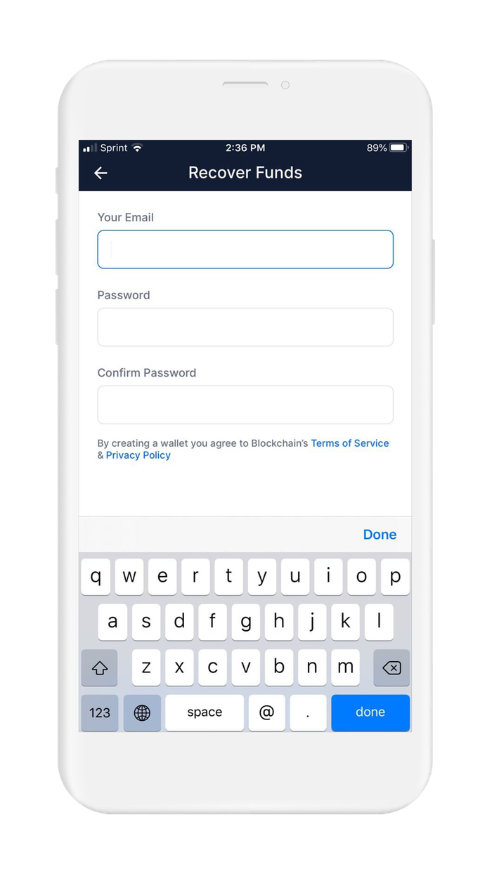 - If you have never used Blockchain.com Wallet with this recovery phrase, you will be prompted to input your email address and a password. If you have used this recovery phrase with Blockchain.com Wallet before, you will be brought automatically to the next step.
