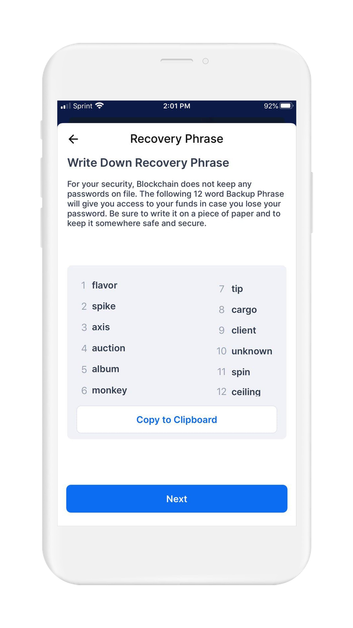 - Blockchain.com Wallet will show you 1 word at a time. Write down the word and tap on next, and write down the next word. Proceed to write down all 12 words. It is very important to write the words in the correct order. You will see why in the next step!