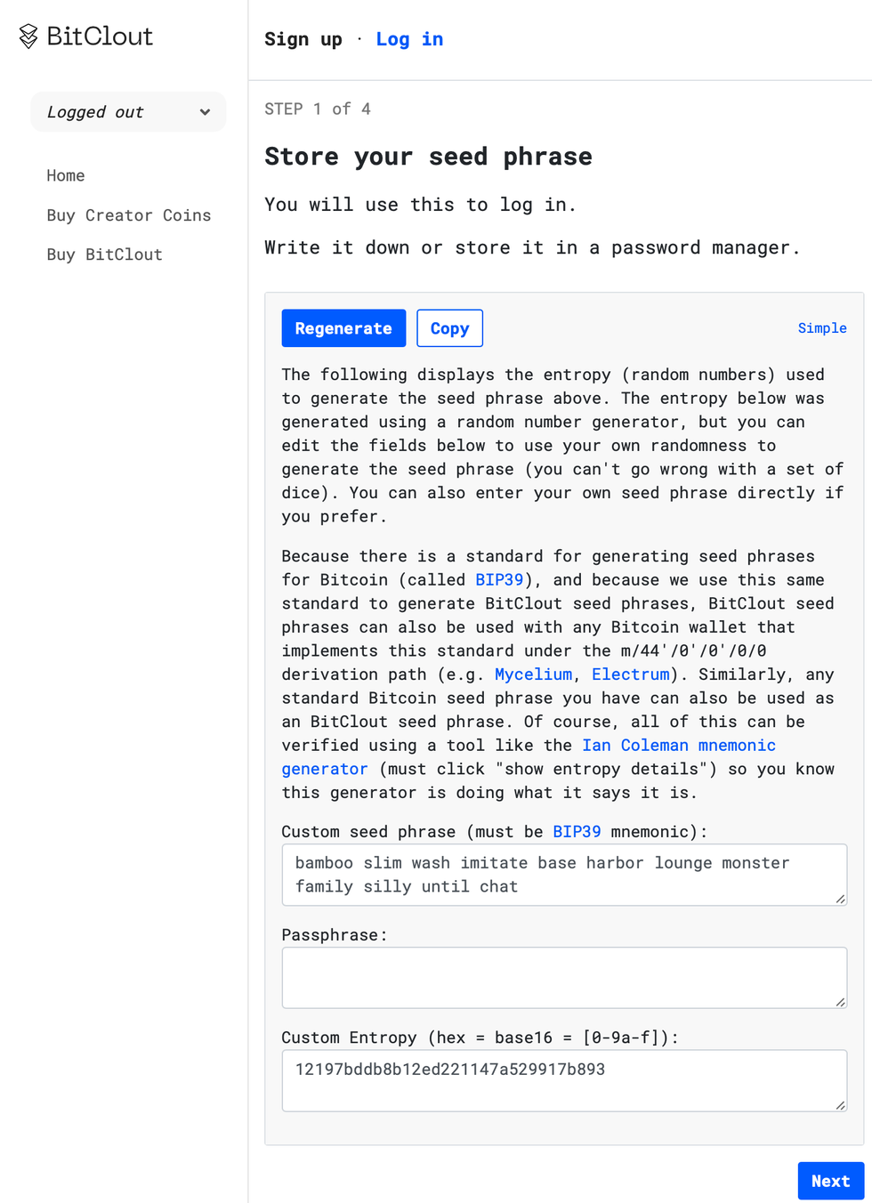 Более того, BitClout предоставляет продвинутым пользователям возможность использовать seed-фразу сгенерированную самостоятельно на основе стандарта BIP39.