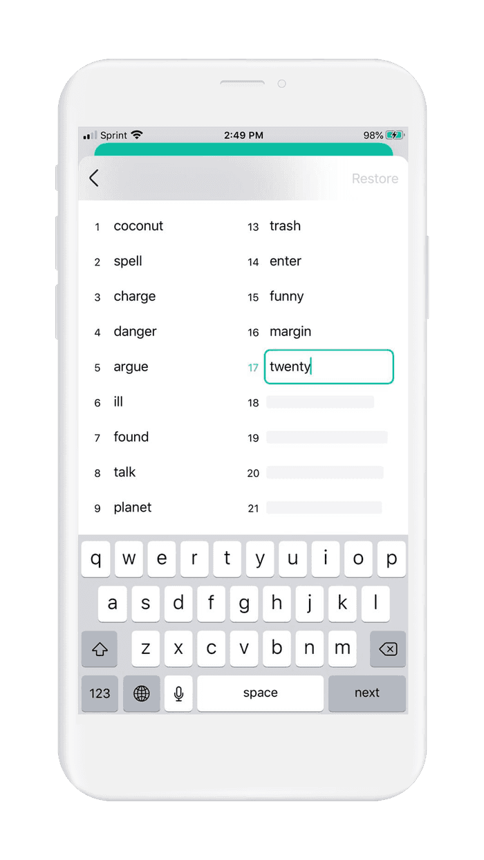 - Returning to your wallet, the wallet will ask you to input your recovery phrase. This step is done to verify that you have copied your recovery phrase accurately.