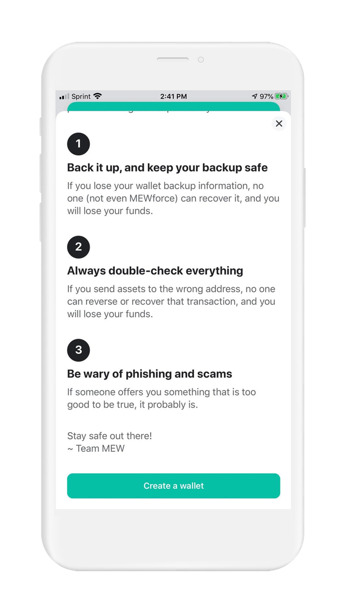 - Before proceeding, MEW will show you some security tips. Read all of them - it only takes a minute. The tips are principles that should be followed anytime you are using cryptocurrency. When you are finished tap on "Create a wallet" to go to the next step.