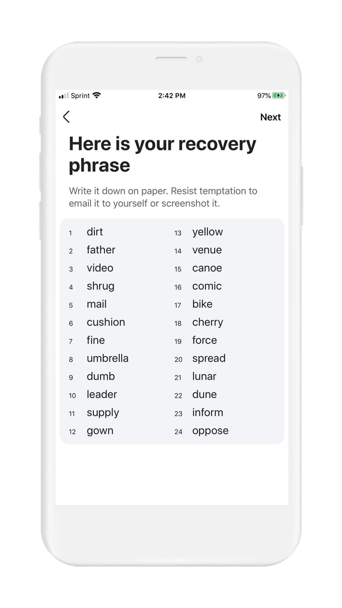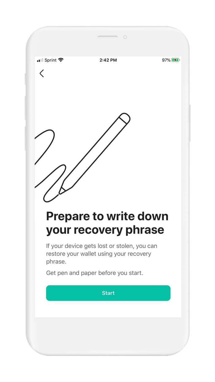 *WARNING: When you follow the steps to backup your recovery phrase, you will be writing the recovery phrase on a piece of paper. It is very important that you backup the recovery phrase on a more reliable medium, and then destroy that piece of paper. Paper is vulnerable to accidental loss, theft, and damage. It is not the safest method of backing up your recovery phrase.