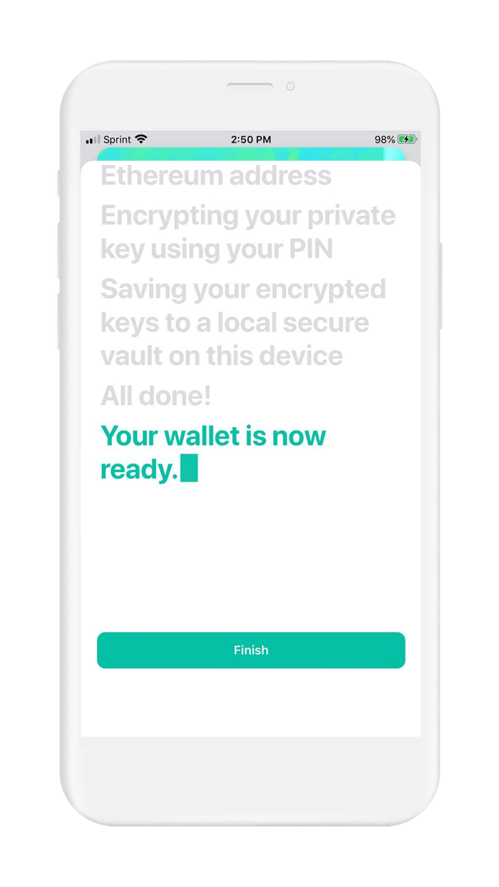 - After configuring biometric authentication, MEW will setup your wallet. On the device screen you can follow along with what is happening. When setup is complete, tap on "Finish" to go to your wallet.