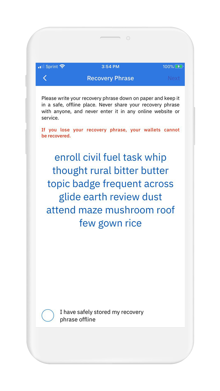 - The wallet will display your recovery phrase on the screen, and ask you to create a backup.
