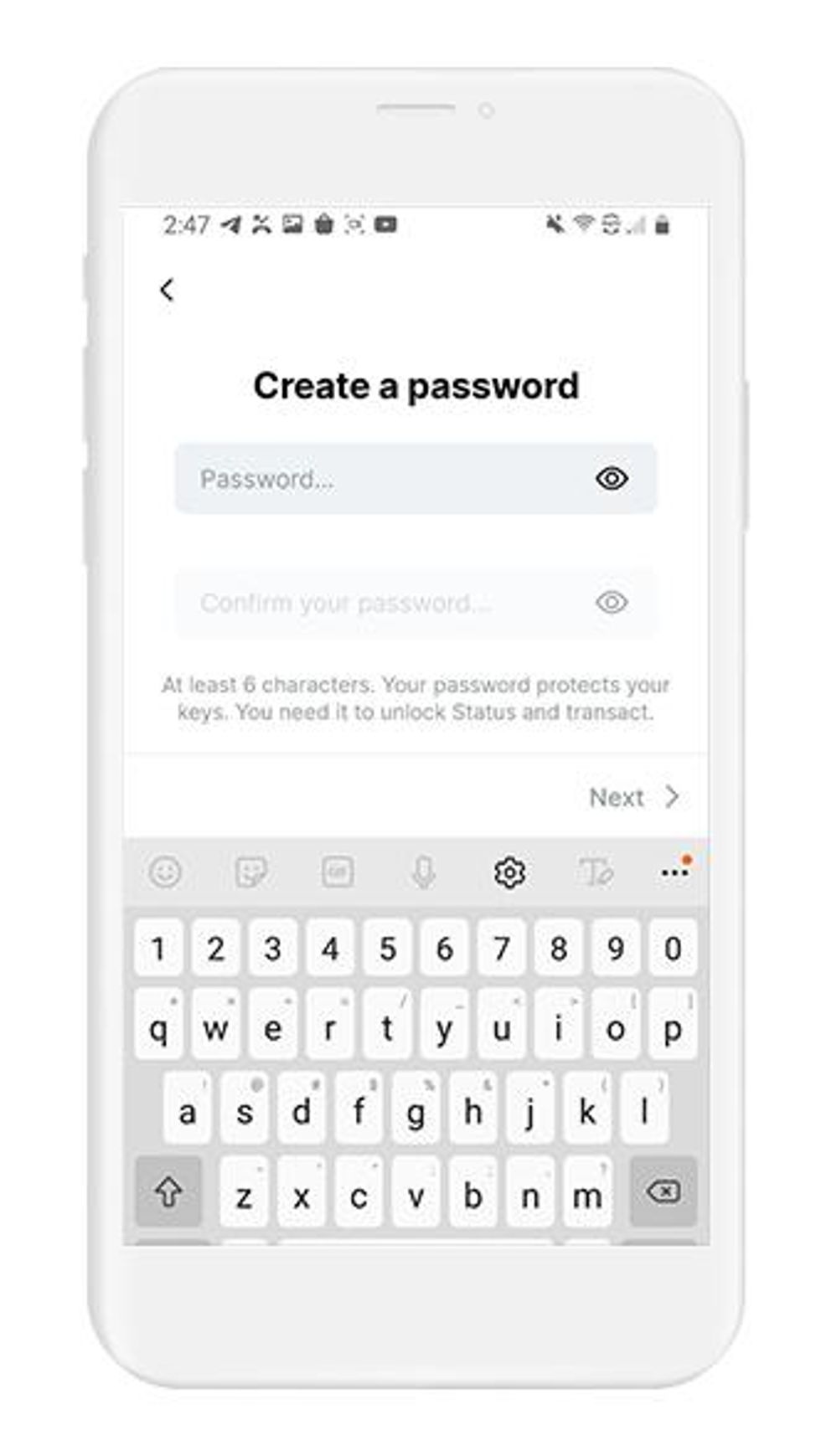Status is a non-custodial wallet, meaning that your private keys stay in your possession. In this step, Status wants to know where you want to store your private keys.
