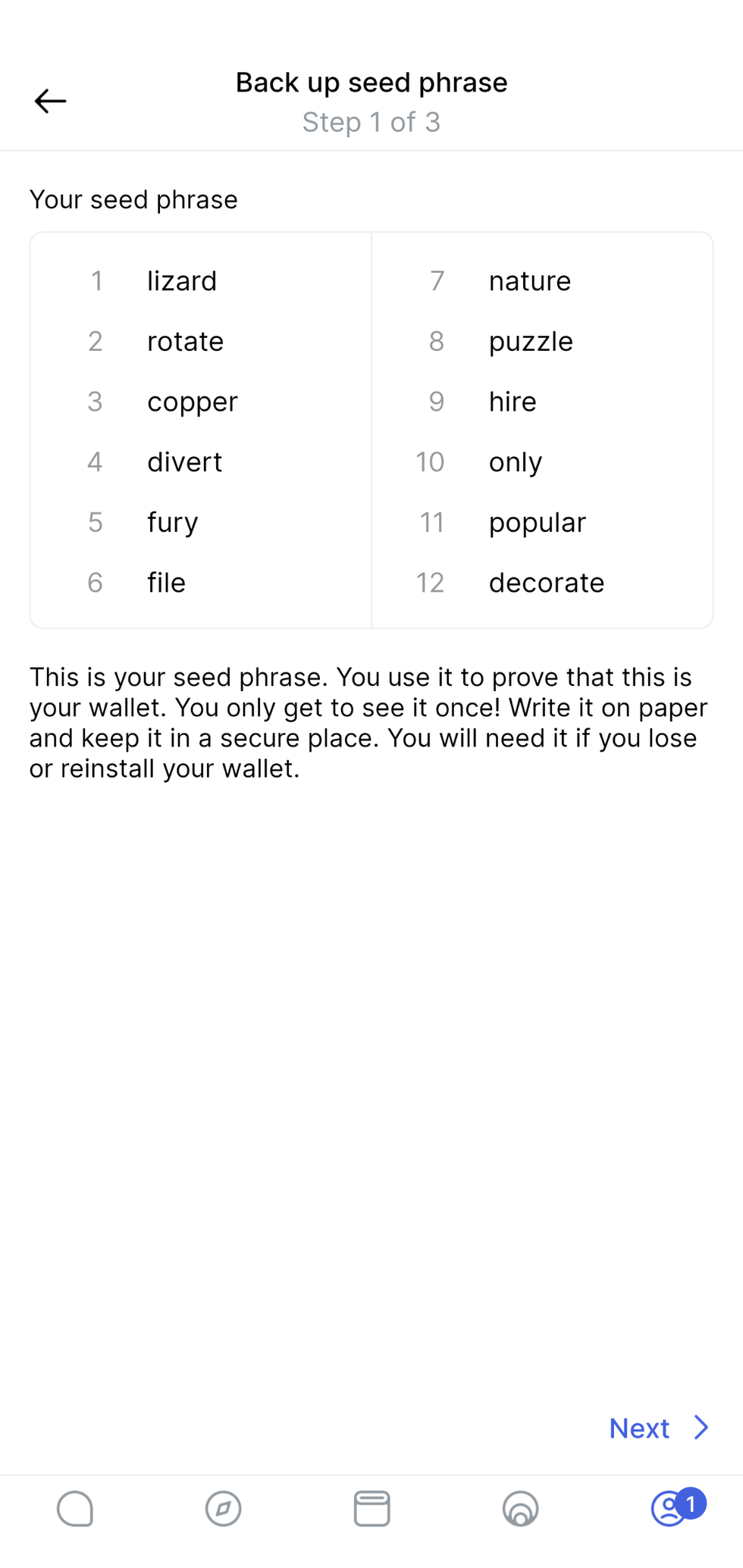 When you follow the steps to backup your seed phrase, you will be writing the seed phrase on a piece of paper. It is very important that you backup the seed phrase on a more reliable medium, and then destroy that piece of paper. Paper is vulnerable to accidental loss, theft, and damage. It is not the safest method of backing up your recovery phrase.
